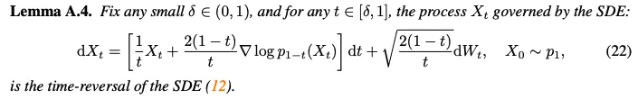 위의 lemma들에서 stochastic interpolant formulation을 사용하는 대신, 직접 도출된 명시적인 coefficient들을 제공 (e.g. $\frac{1}{1-t}, \frac{t}{1-t}$)