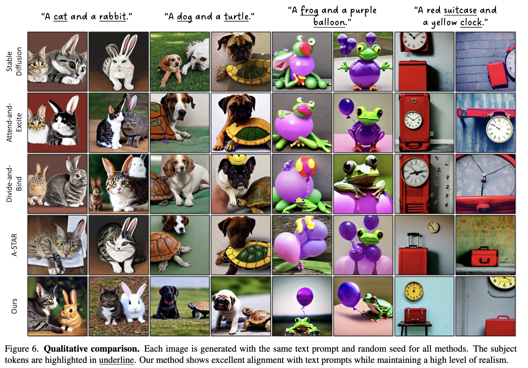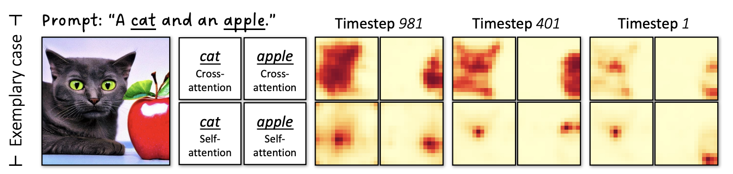 Cross-attention map은 text와 image feature 사이의 관계를 capture하고, self-attention map은 image feature 안의 공간적인 위치 사이의 관계를 capture한다. 이러한 map들은 subject neglect와 subject mixing을 효과적으로 측정한다. 이러한 map들을 이용해, 본 논문은 cross-attention response score와 self-attention conflict score를 디자인한다. Score threshold를 셋팅함으로써, inital noise space의 partitioning을 달성한다. 본 논문에서는 subject의 정확한 rendering이 정확한 attribute binding을 조성한다는 것을 발견한다.