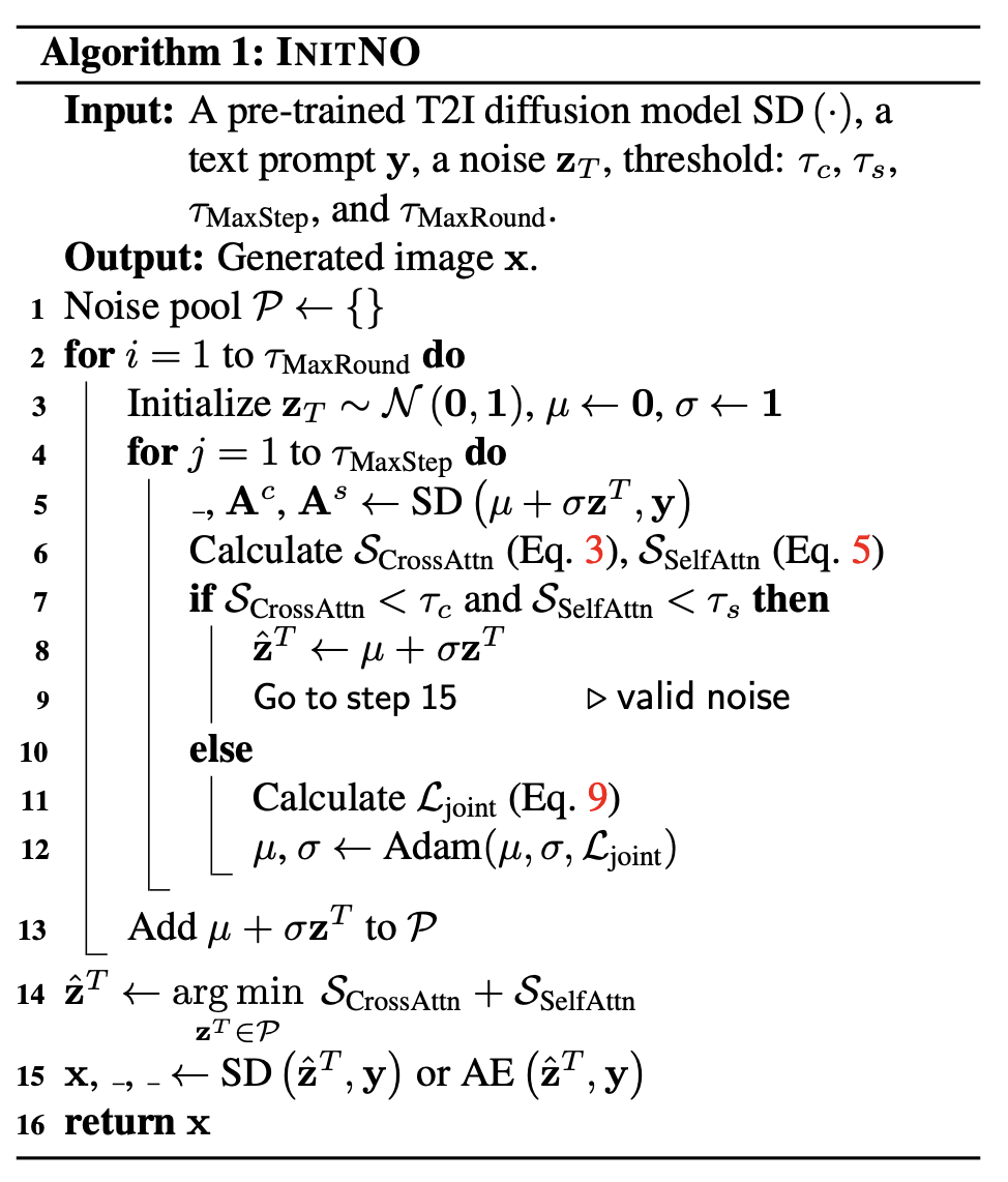 모든 random noise가 의미적으로 faithful한 이미지를 생성하는데 효과적이지 않다. 본 논문에서는 cross-attention response score와 self-attention conflict score를 디자인해 initial noise를 평가하고, 이를 이용해 noise를 optimization하는 InitNO를 제안한다.