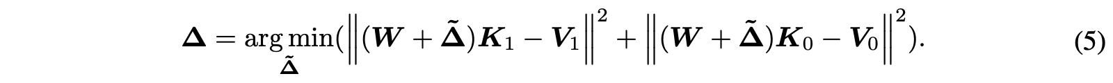 (13)을 풂으로써 최종 perturbation $\boldsymbol{\Delta}_{\mathbf{AlphaEdit}} = \boldsymbol{\Delta}\mathbf{P}$을 얻고 이는 model parameters $\mathbf{W}$에 더해진다.